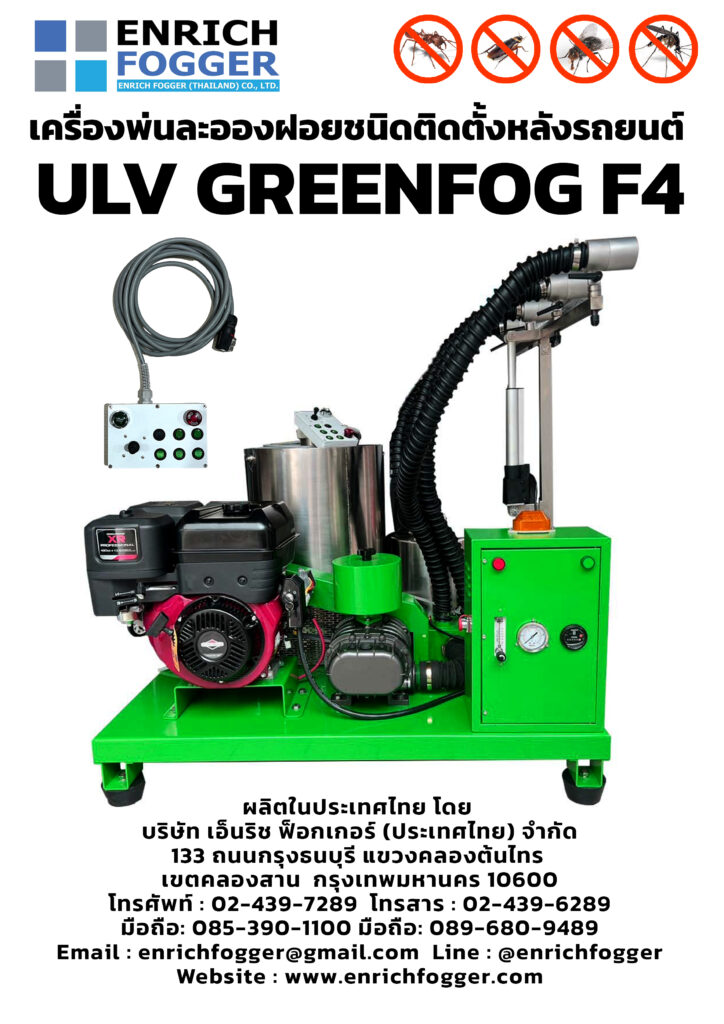 เครื่องพ่นเคมี เครื่องพ่นฝอยละอองละเอียด (ULV) ชนิดติดตั้งท้ายรถยนต์ GREENFOG F4 ทำงานด้วยเครื่องยนต์เบนซิน ชนิด 4 จังหวะ กำลังเครื่องยนต์ 13.5 แรงม้า การขับเคลื่อนด้วยระบบสายพาน ระบบสตาร์ทเครื่องยนต์เป็นระบบไฟฟ้า สามารถควบคุมการทำงาน ด้วย Remote control โดยมีระบบปิด-เปิดเครื่องยนต์และสารเคมีทั้ง 2 ระบบ อัตราการไหลของสารเคมี 0-60 ลิตร/ชั่วโมง หัวฉีดพ่นสารเคมี ทั้ง 4 หัว สามารถปรับทิศทางการพ่นได้อย่างอิสระ ขนาดของเม็ดฝอยละอองสารเคมี ที่เครื่องพ่นผลิตได้มีค่า VMD ไม่เกิน 30 ไมครอน โดยวัดที่อัตราการไหลไม่น้อยกว่า 25 ลิตร/ชั่วโมง วัดที่ระยะ 8 เมตร จากหัวพ่น ถังบรรจุสารเคมี ทำจากวัสดุที่ทนต่อการกัดกร่อนของสารเคมี และตัวทำละลายอื่นๆ ขนาดบรรจุ 75 ลิตร และสามารถอดแยกจากเครื่องได้อย่างอิสระ ถังบรรจุน้ำมันเชื้อเพลิง ทำด้วยวัสดุที่แข็งแรงทนทาน ขนาดบรรจุน้ำมันเชื้อเพลิง 6 ลิตร มีระบบการทำความสะอาดด้วยน้ำ ล้างระบบการพ่นสารเคมีหลังการใช้งานเพื่อป้องกันการ อุดตันของน้ำยา หรือสารเคมี